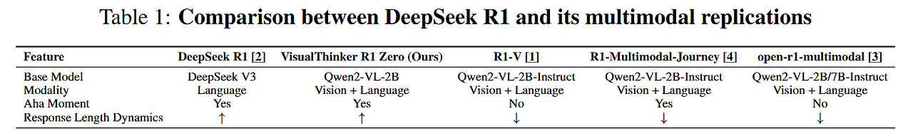 - 이런 특성이 없는 다중 모드 복제 모델들(추론용): R1 접근 방식의 유효한 구현으로 간주될 수 있는지는 의문 (wow.. swag…)