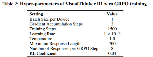 - Qwen2-VL-2B 기본 모델에서 시작하여 강화 학습을 직접 수행