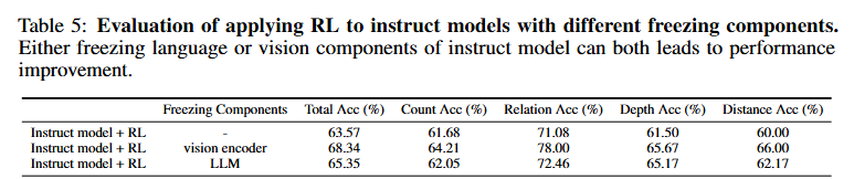 - RL 동안 비전 인코더를 고정할 때 모델이 더 정교한 추론 전략 개발에 집중할 수 있다고 가정