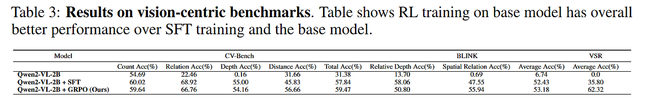 - SFT에 RL을 적용하면 CVBench에서 모델의 성능이 향상
