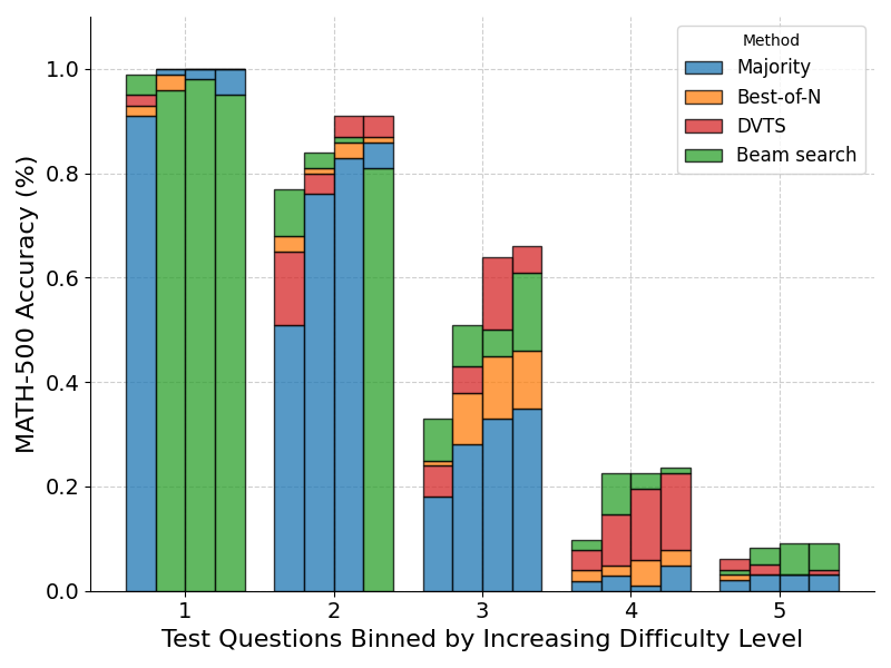 - Beam Search는 중간 및 어려운 문제에서는 Best-of-N 또는 Majority Voting이 더 나은 성능