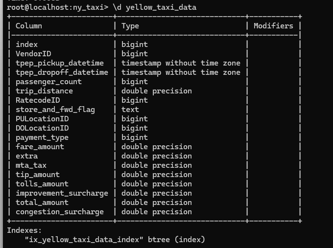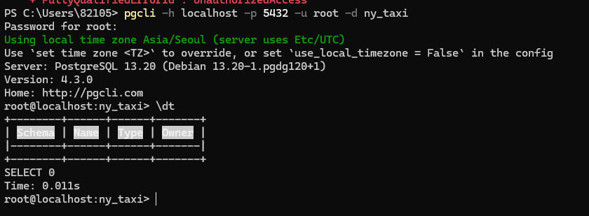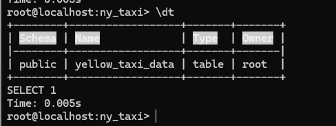pgcli -h localhost -p 5432 -u root -d ny_taxi
