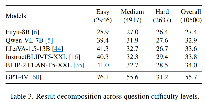 - 난이도가 올라갈수록 GPT-4V와 격차 줄어듦
