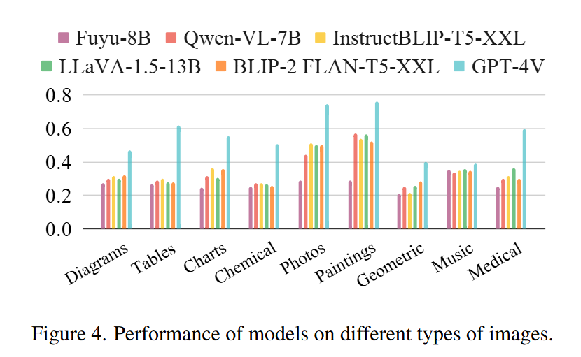 - 시각 데이터가 덜 복잡한 예술 및 디자인, 인문학 및 사회과학과 같은 분야에서는 모델이 더 높은 성능, 반대로 비즈니스, 과학, 건강 의학, 공학 등은 낮은 성능