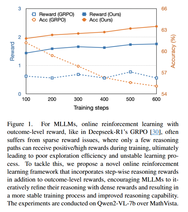 - → MLLM 추론 학습에서 희소 보상 문제로 어려움을 겪는 경우가 많아 최적의 성능을 얻지 못함,