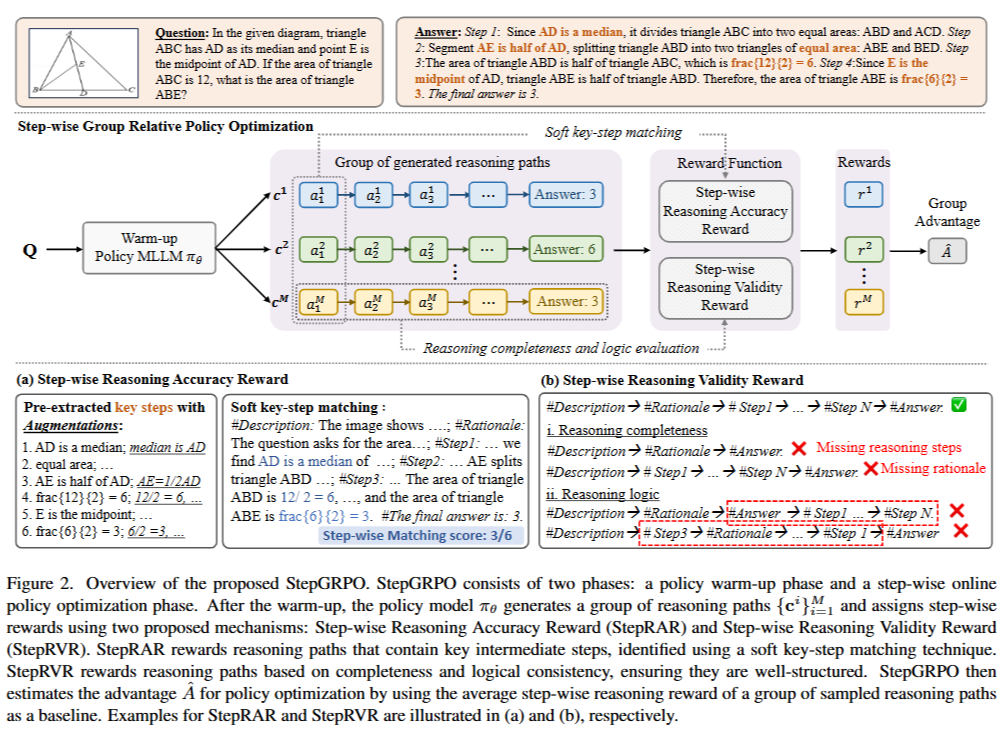 - Step-wise Reasoning Validity Reward (StepRVR): 추론 완전성 및 논리 평가 전략을 통해 잘 구조화되고 논리적으로 일관된 추론 과정을 따르는 추론 경로에 보상