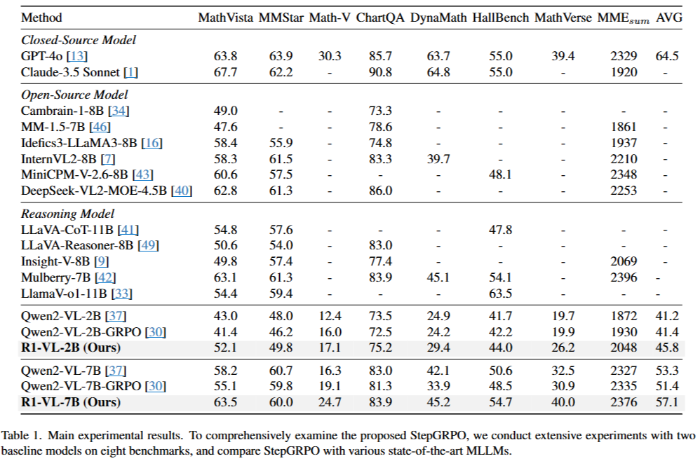 - 제안된 StepGRPO를 통해 뛰어난 추론 능력을 갖춘 일련의 MLLM인 R1-VL을 개발