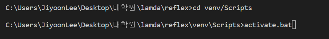 - 커맨드에 Scripts 폴더로 이동해준 뒤, activate.bat 입력