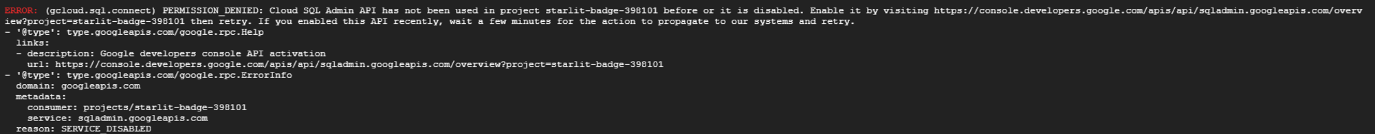 이전에 GCP 썼을 때에는 아무 문제 없는데 새롭게 계정을 파고 cloud shell sql 연결 시도하려고 하니 위와 같은 에러가 떴습니다.