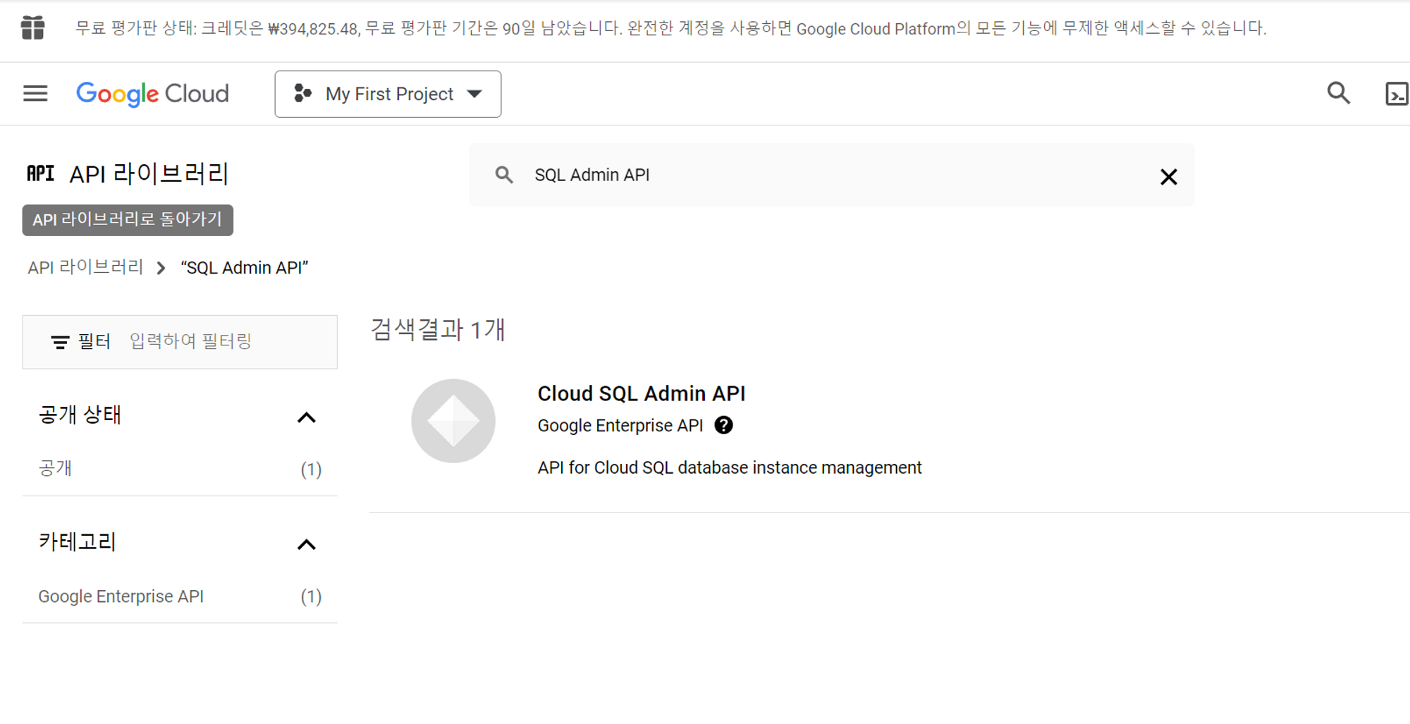 1. 왼쪽 패널에서 [API 및 서비스] 카테고리에서 [라이브러리]에 들어가서 "SQL Admin API"를 검색합니다.