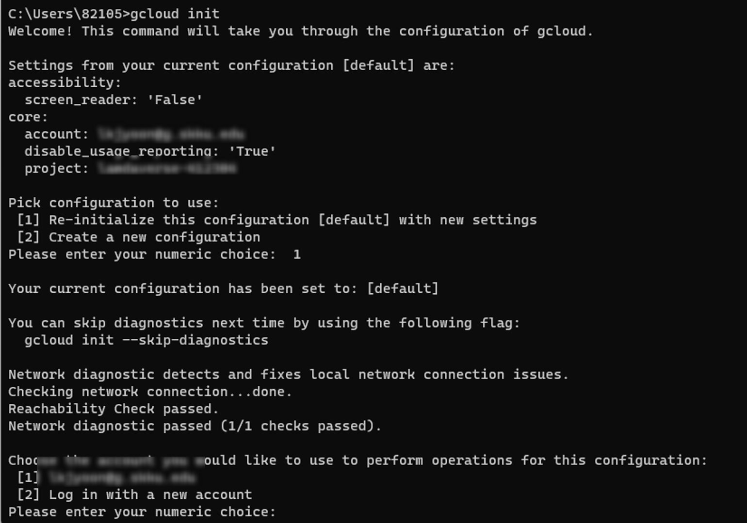 (혹 만약 다른 프로젝트로 설정을 하시고 싶을 때에도 다시 gcloud init 을 해서 초기화해주신뒤 선택해주시면 됩니다.)