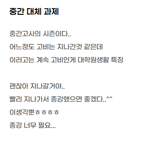 | [공부log 24.04.19]대학원생의 다이어트, 중간 대체 과제들, 근황 등 (2) | 2024.04.19 |