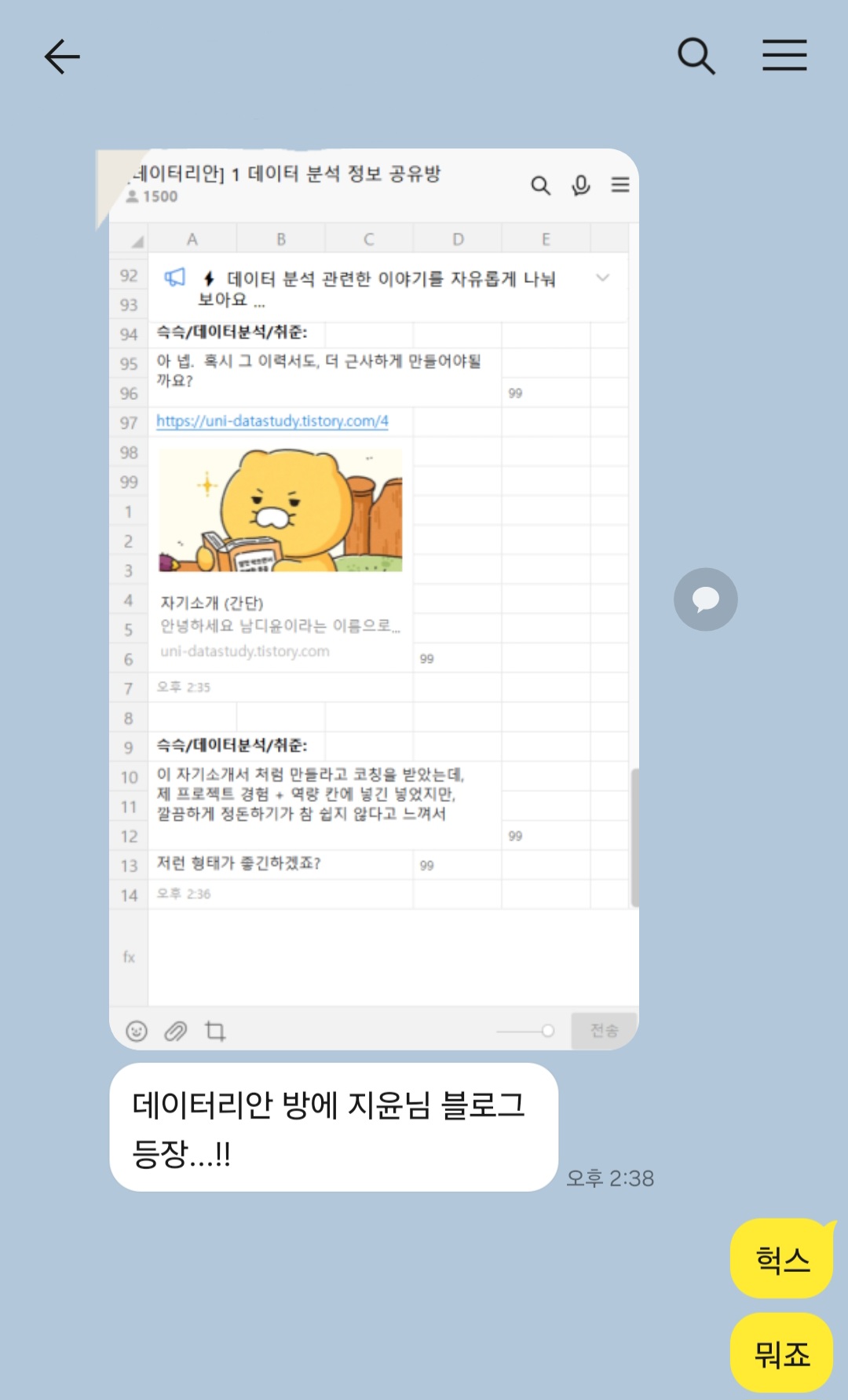이번주 주중에 하루 데이터리안 오픈채팅 방에 내 블로그 자기소개 페이지가 공유가 되었다는 소식을 들었다
