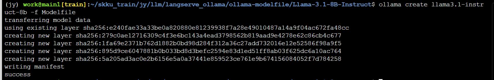 그 다음 ollama create ~를 입력하면 잘 실행되고 있는 모습