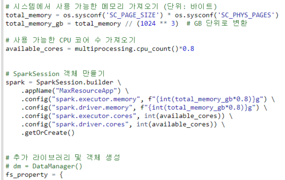- 파티션 크기: 할당된 메모리와 관련. 큰 파티션은 더 많은 메모리 필요.pyspark sparksession config 설정