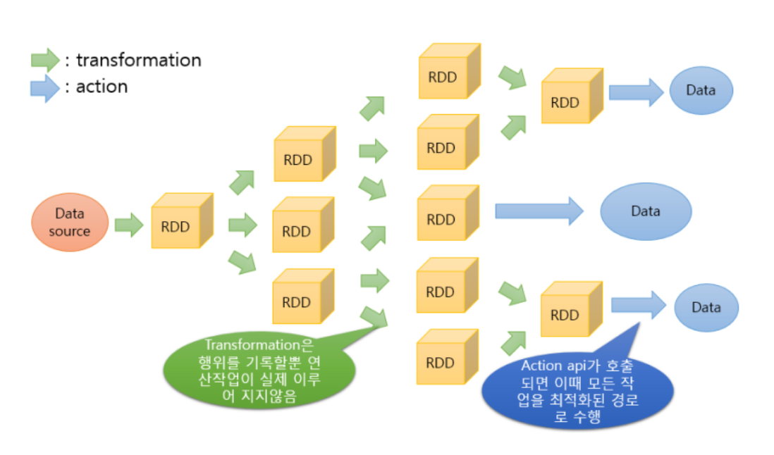 - Data Source로부터 최종 Data에 도달하기 위해서는 많은 RDD가 새로 생성, 변형 작업 발생