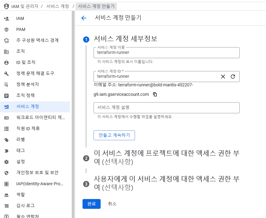 - GCP IAM&Admin에서 서비스 계정 설정,