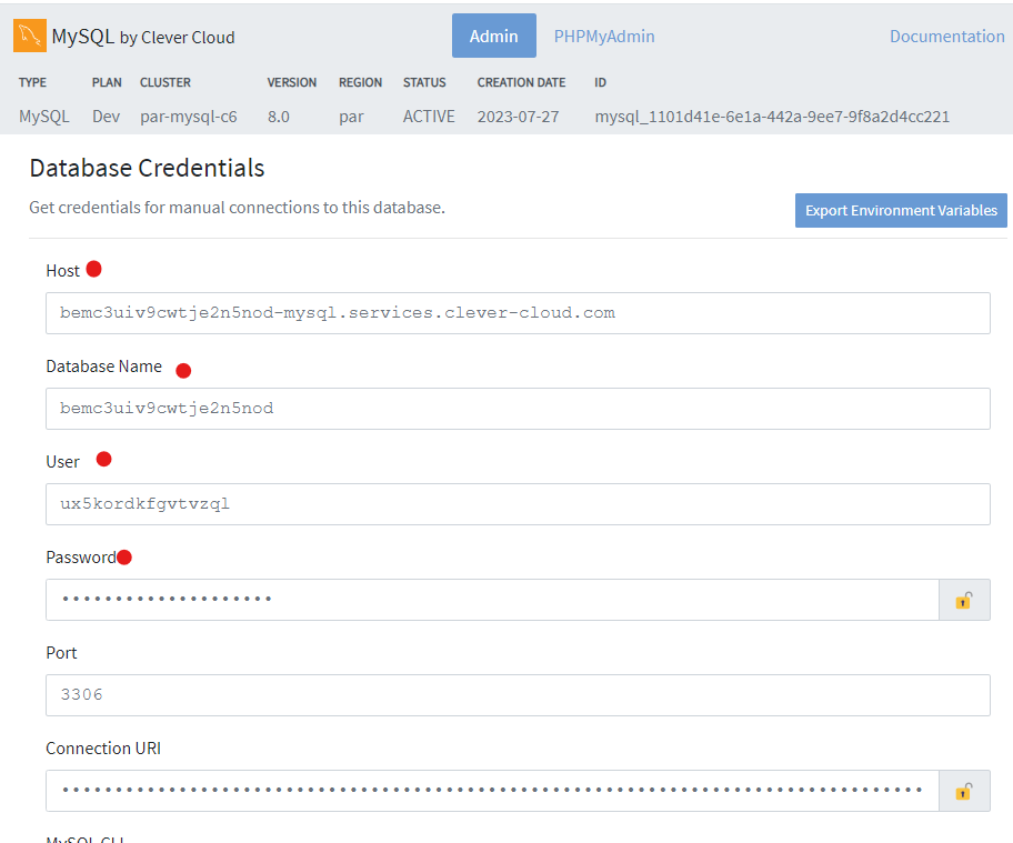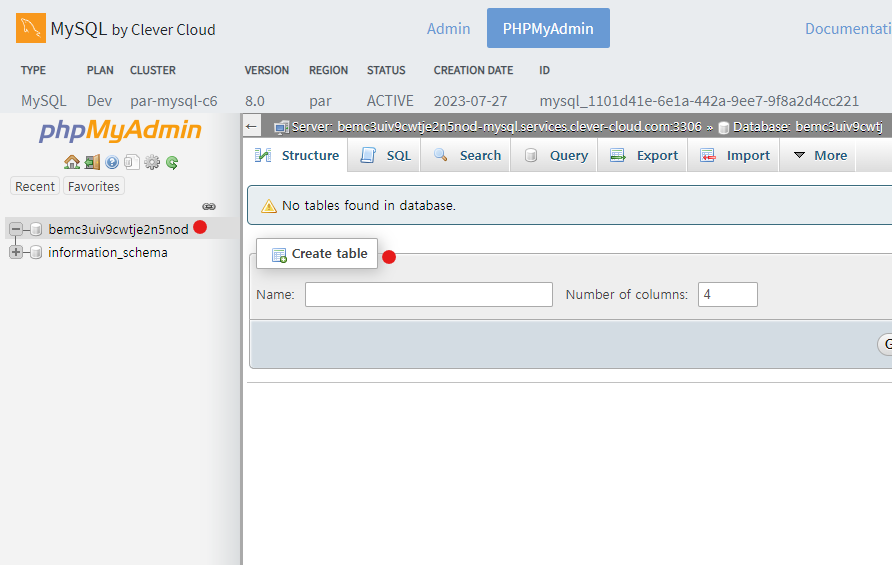 clever cloud 에서 PHPMyAdmin에 들어가줍니다 (조금 기다려야 창이 떠요)