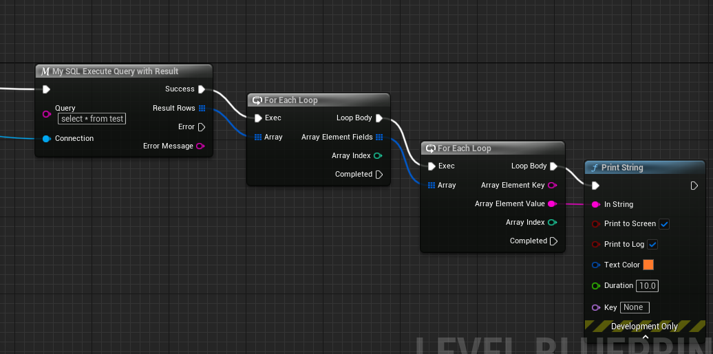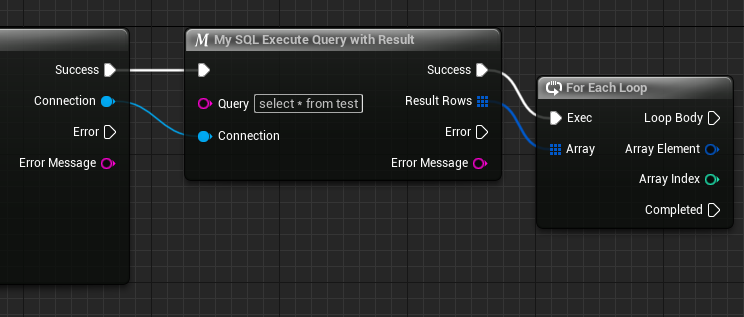 블루프린트로 돌아가서 [My SQL Execute Query with Result] 를 만들어준 뒤 [My SQL Connect] 와 아래와 같이 연결해줍니다.