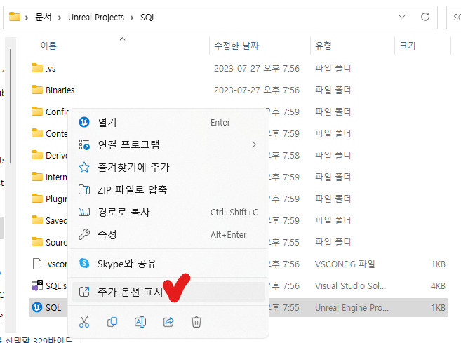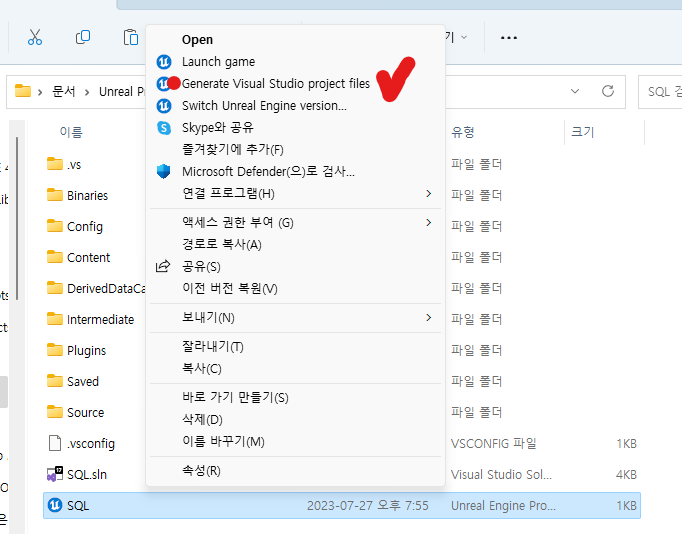 언리얼엔진 프로젝트가 있는 폴더로 이동합니다.