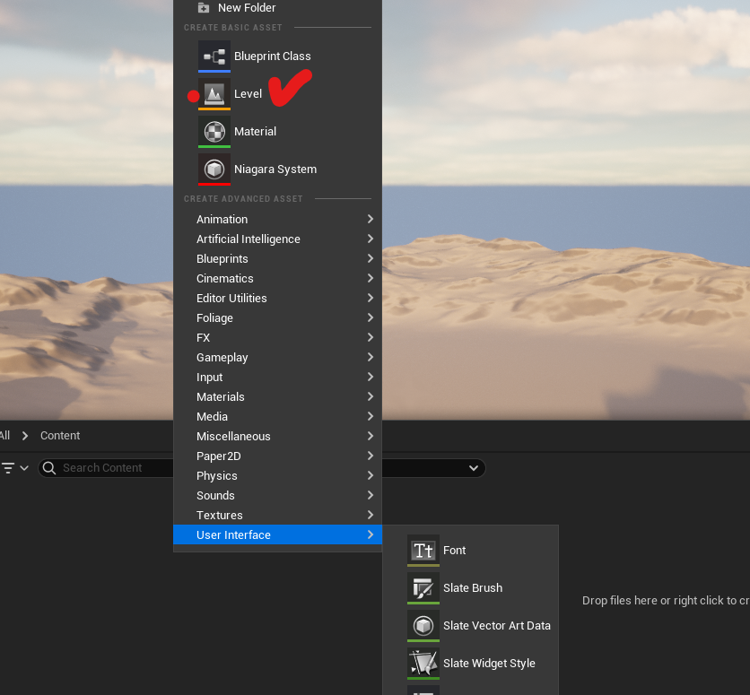 영상과 마찬가지로 [Content Drawer] 에서 [Content 폴더에서 오른쪽 클릭] [Level 에셋]을 생성해줍니다.