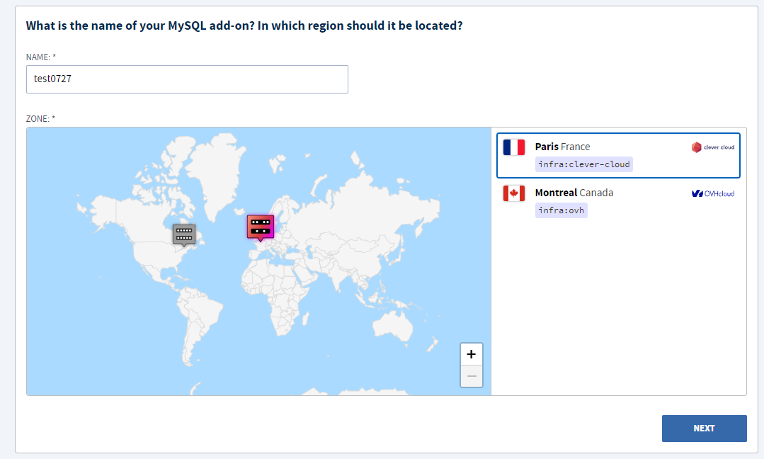 확실한 건 [+Create] - [Mysql Select] - [DEV] 선택 (무료 버전 선택) - [이름 정하고, 나라 선택]